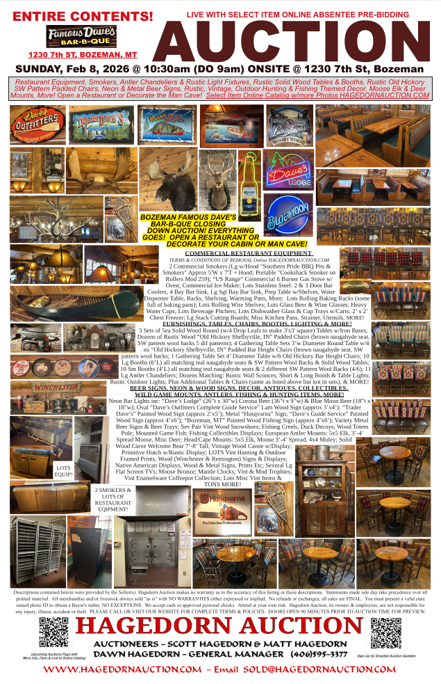 NEXT AUCTION IS SUNDAY, FEB 8, 2026 - THE ENTIRE CONTENTS OF FAMOUS DAVE'S BBQ LOCATED AT 1230 N. 7th ST, BOZEMAN, MT - SCROLL DOWN FOR FLYER!